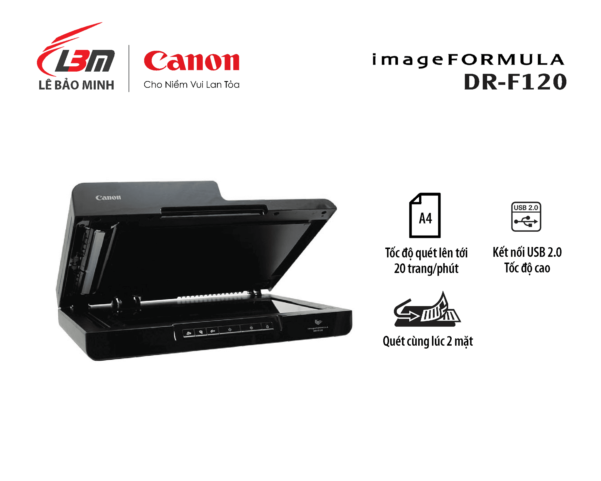 Máy scan Canon DR-F120 tích hợp ADF + mặt kính phẳng, scan 2 mặt tự động, tốc độ cao, OCR thông minh. Giải pháp số hóa tài liệu A4 hiệu quả cho văn phòng.